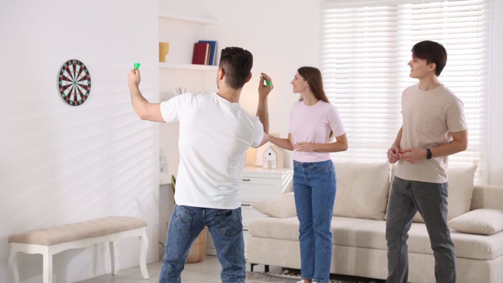 - Ibland ingår även dartmatta, belysning och i mer kompletta paket ett dartskåp som döljer tavlan när den inte används.